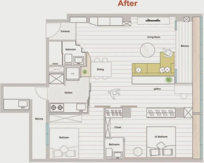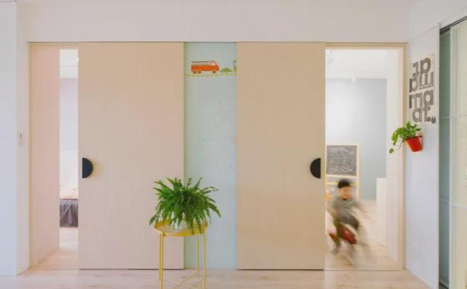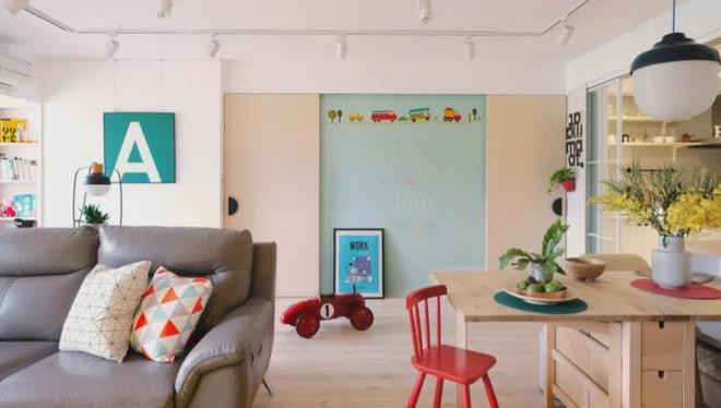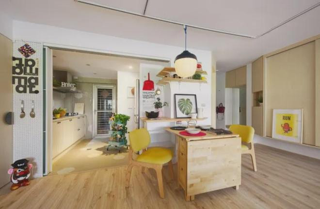 客厅和餐厅之间腾出小过道,正前方的卧室墙板做成玻璃画板,给大人小孩涂鸦画画,可以在家自己给孩子补课。