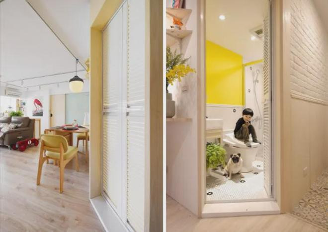 卫生间布置在进门的转角区域,一边用柜门特意隔开一个柜子,给人一种处处有惊喜的感觉。